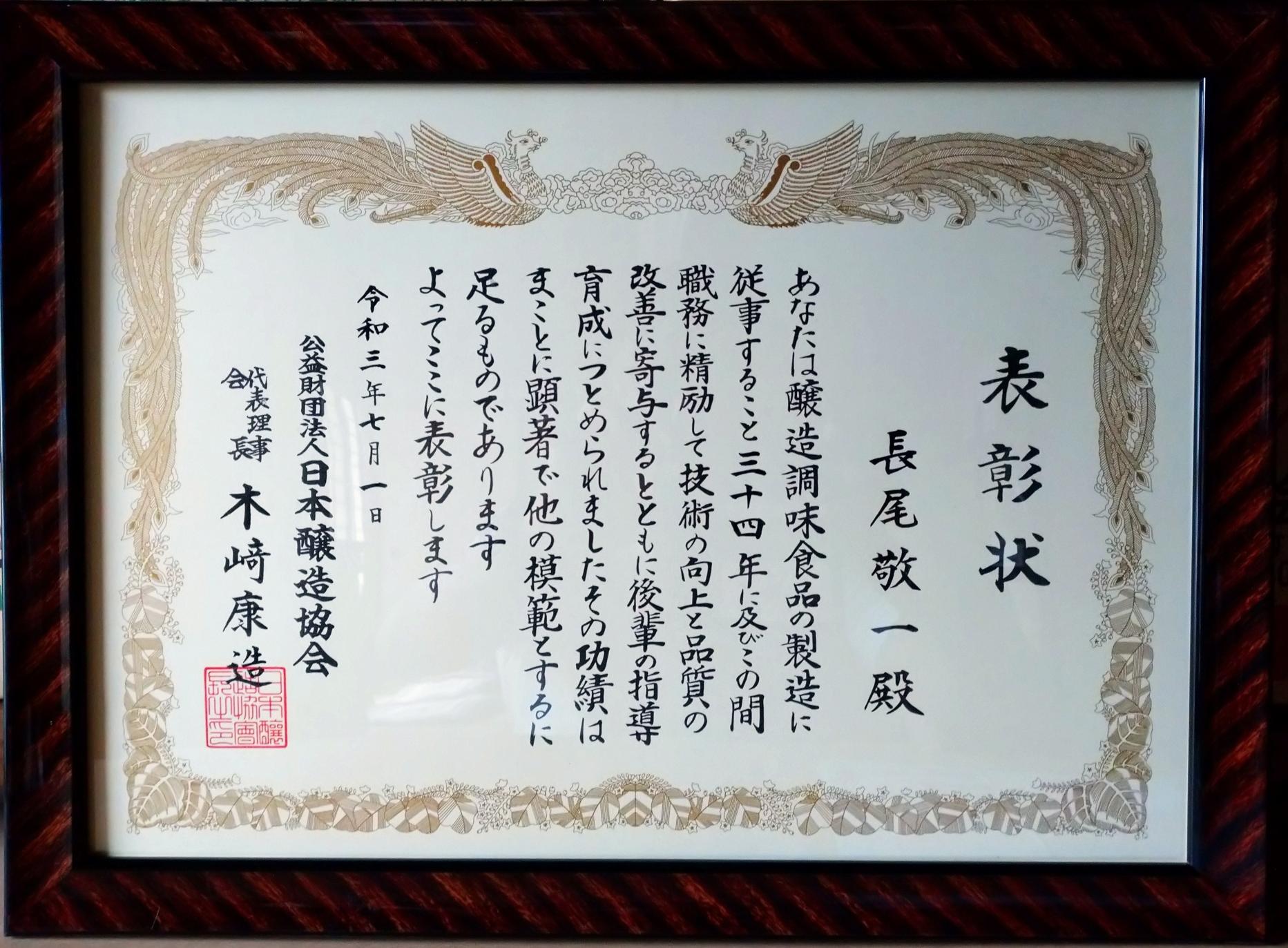 当社工場長「長尾敬一さん」が令和3年度醸造技能者表彰受賞しました!